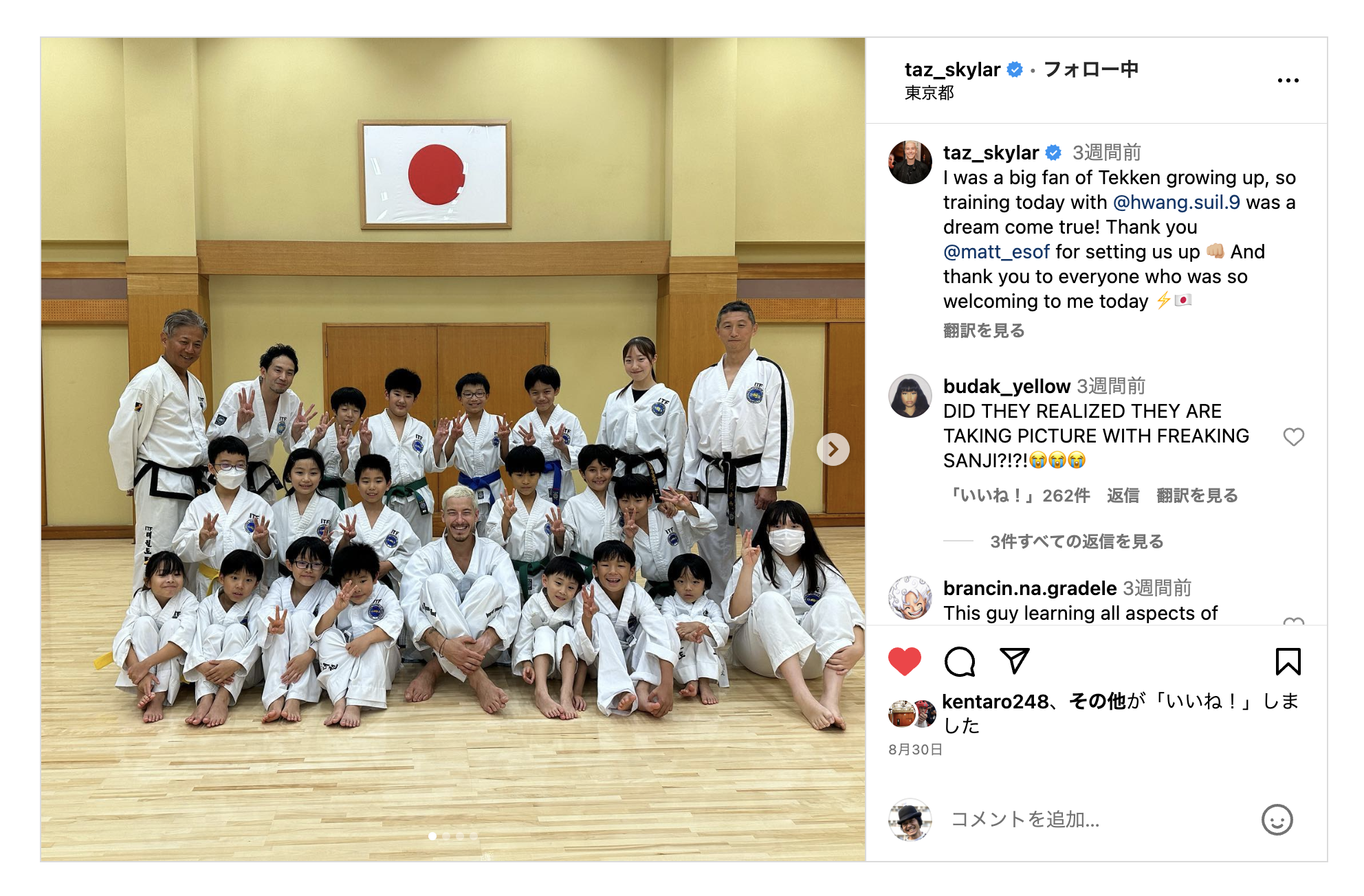 ワンピース実写版サンジ役のTAZさんとテコンドーの練習をしました。まとめ。