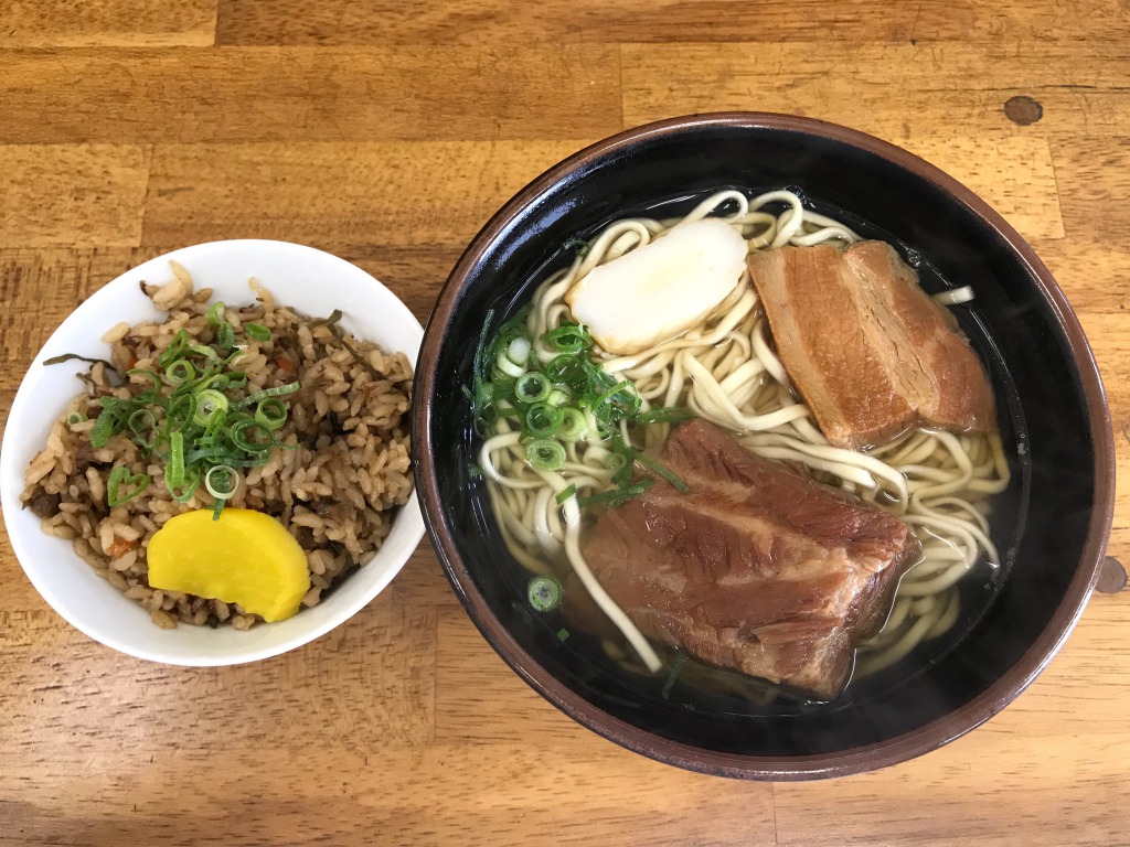 三枚肉、ソーキの沖縄そばと、念願のジューシー。
