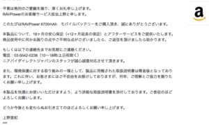 購入のお礼となんと18ヶ月の保証の案内。