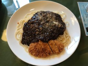 ミートソーススパゲッティーにトンカツが乗っています。