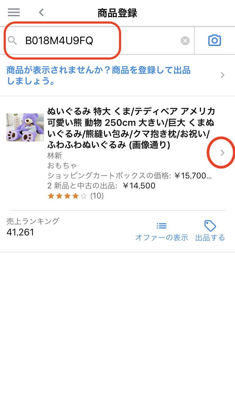 3.ASINを貼り付けて、「>」をクリック。