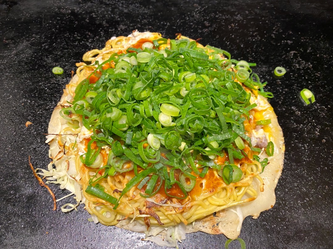 そば入り、牛すじ、九条ねぎトッピングに。