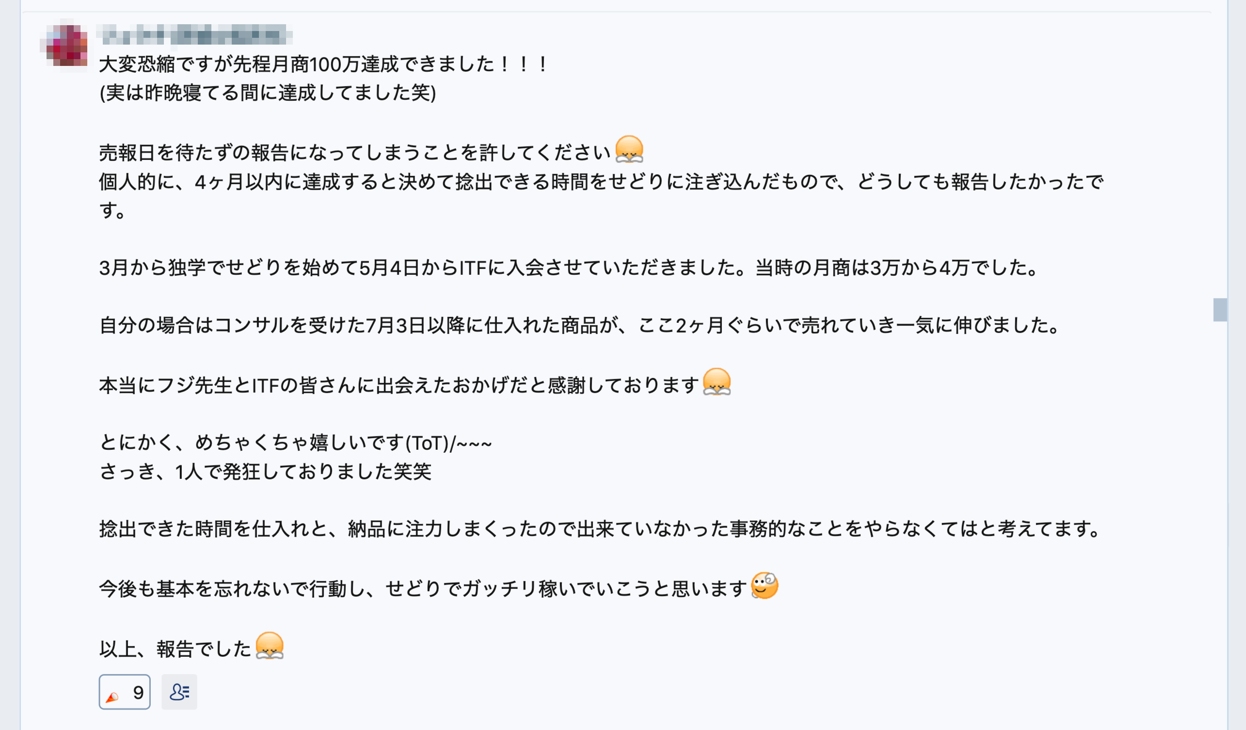ITF入会4ヶ月、フジップリンの出張コンサルを受けた2ヶ月後に月商100万円を達成しました。