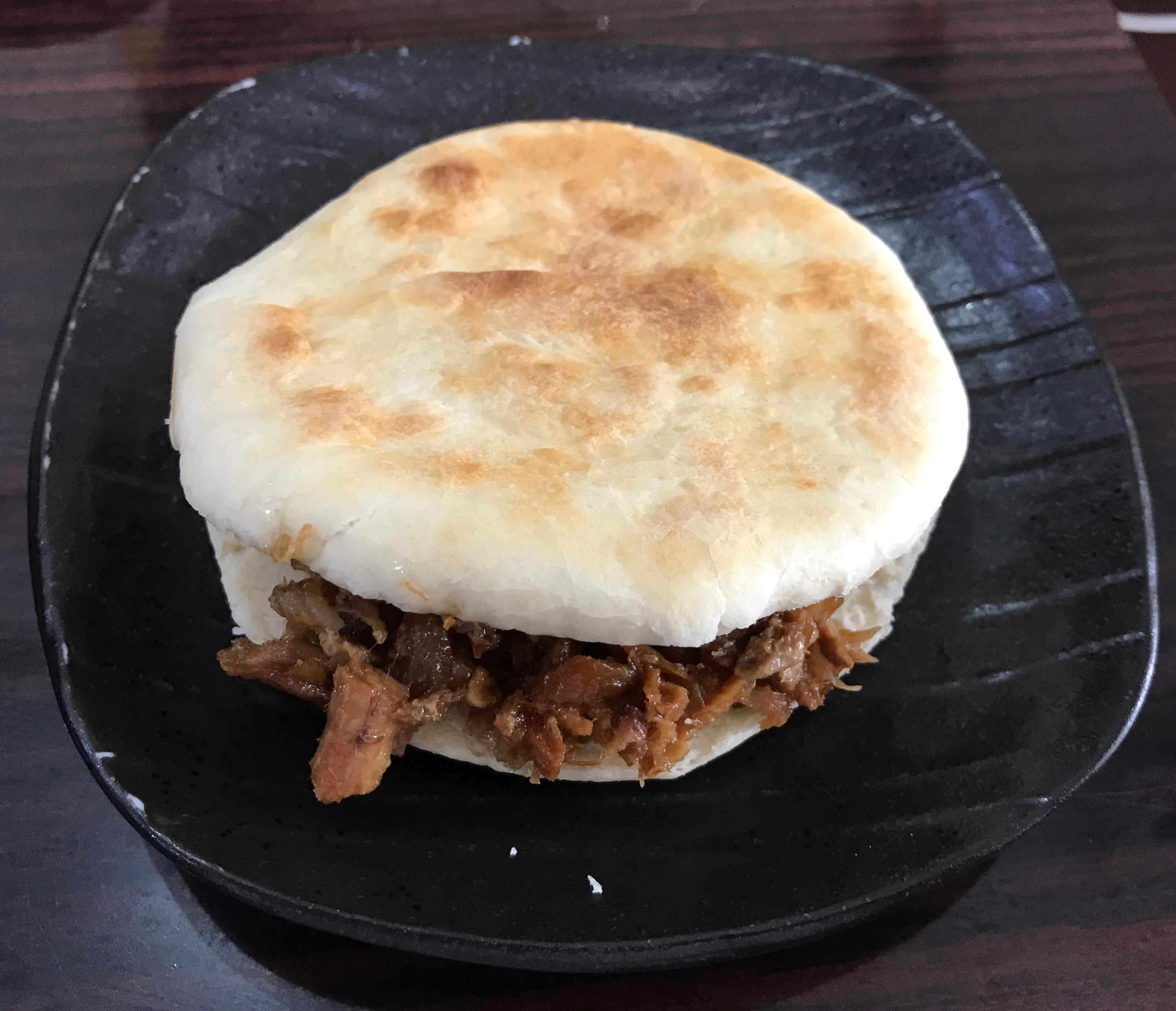 初めて食べるパンのような生地に豚肉がサンドしてあります。