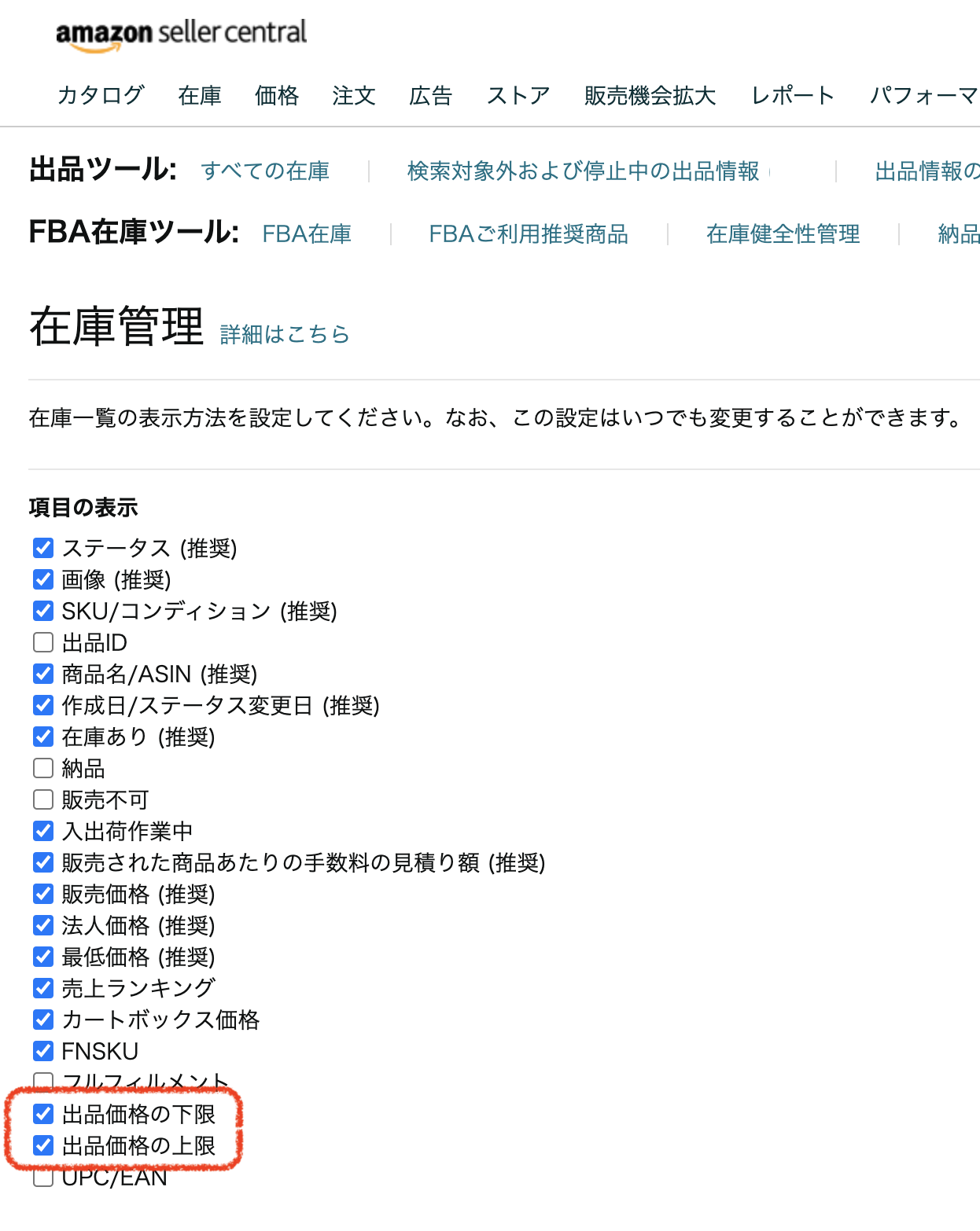 出品価格の上限、出品価格の下限にチェックを入れましょう。