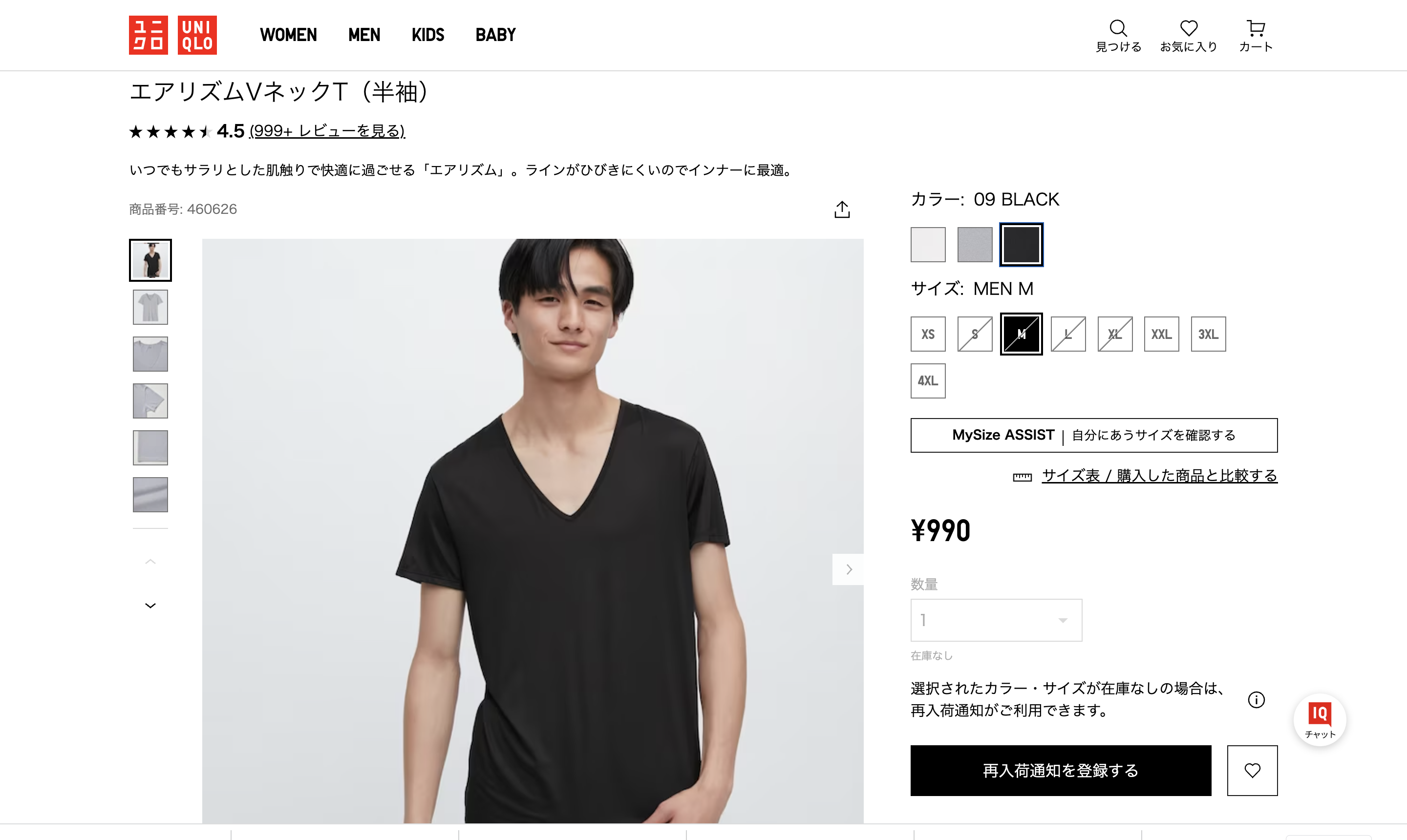 ユニクロ エアリズムVネックT(半袖) 990円(クリックすると移動します)