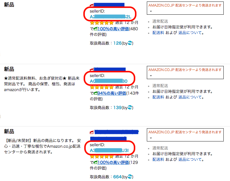 販売者の下の赤で囲ったところが Seller ID です。