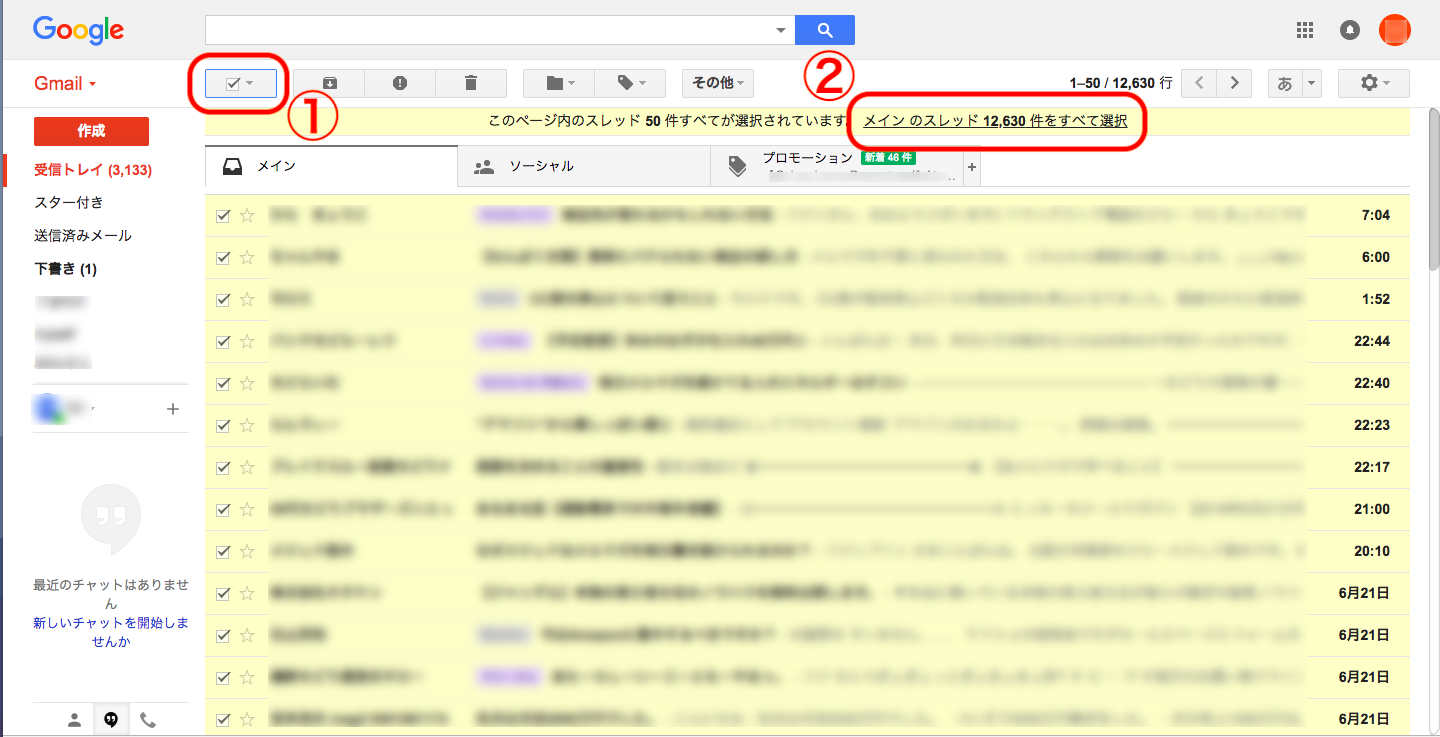 ②「メインのスレッド◯◯◯件を全て選択」をクリックします。