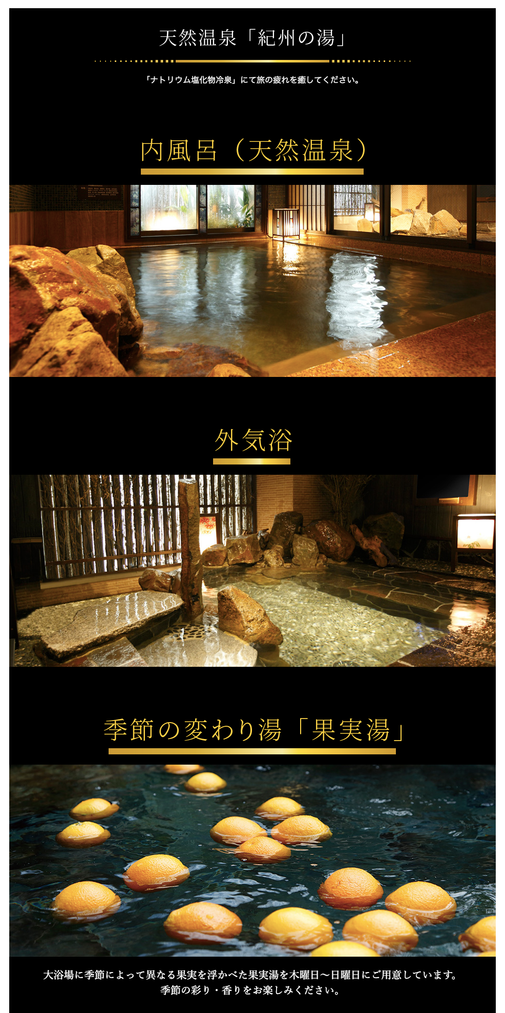 天然温泉「紀州の湯」に15時から翌朝10時まで入れます。